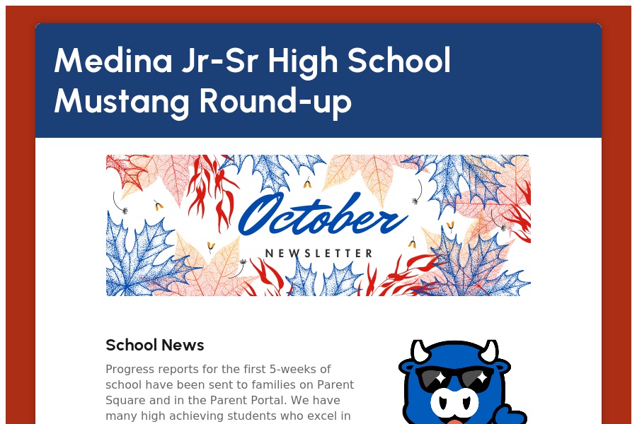 Medina Jr-Sr High School Mustang Round-up School News Progress reports for the first 5-weeks of school have been sent to families on Parent Square and in the Par. . .